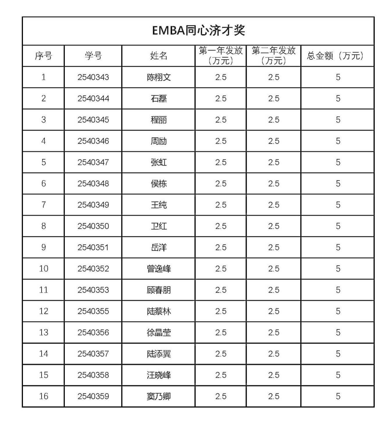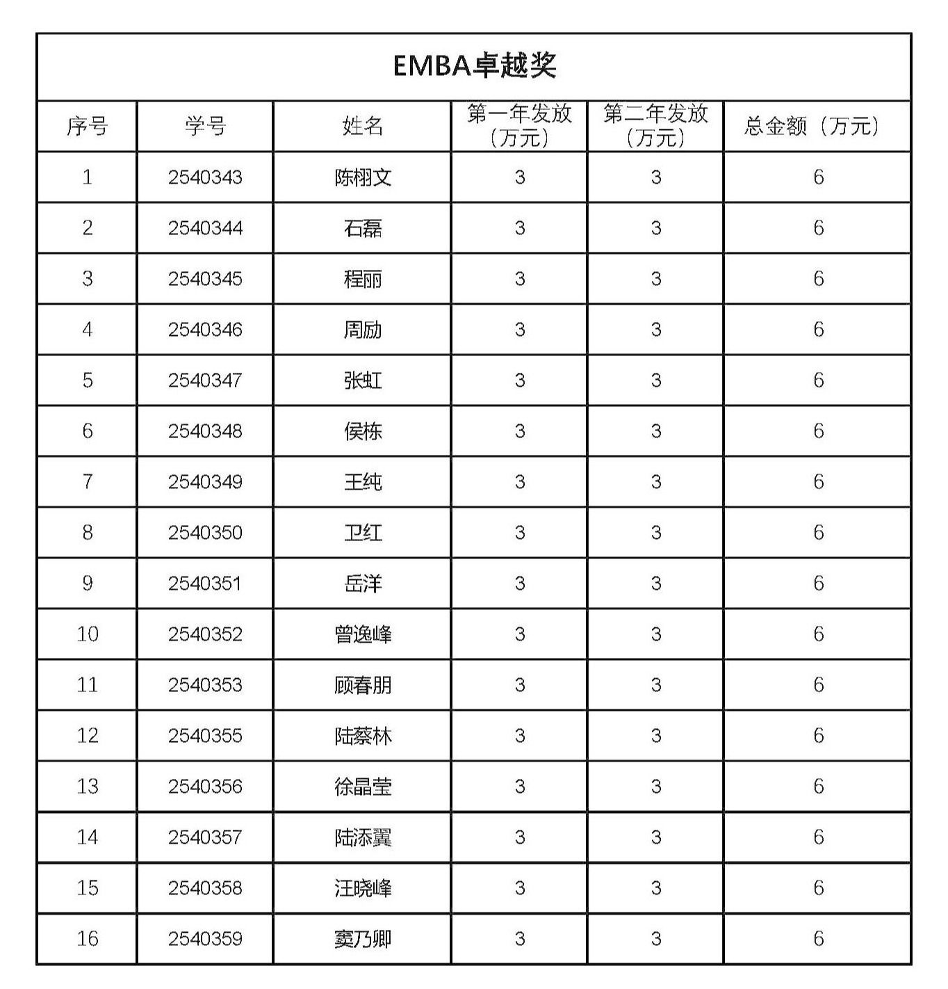 本着公平、公开、公正的原则,依据《经济与管理学院特色奖学金(专业学位——2025年入学EMBA项目)评定实施细则》,据奖学金评审委员会审核结果决定,以下同学获得2025级EMBA新生奖学金。